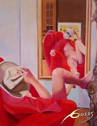 L'image est nette, le trait est lisse et la pose assurée. Je ne pense pas que cette jeune femme s'essaye devant son miroir, car il y aurait un tremblement, un doute, une anxiété, flottant dans l'air ou dans le dessin. La main gauche est relâchée. Même la couleur porte à la certitude. Cette femme est une force. Le pied volontaire posé sur son double, elle maîtrise son image, l'impose. (En lui mettant un pinceau entre les doigts de pied, elle signerait sa création). Bravo pour la mise en scène (et la réalisation) qui nous pousse toujours à inventer une vie aux personnages en dehors des tableaux.