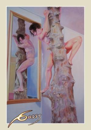 Accrobranches Elle est seule, à l'intérieur, accrochée à un tronc d'arbre, ce n'est pas banal. Certains excentriques mettent des murs d'escalade dans leur salon, rarement des troncs de cette dimension. Comme la pièce est vide, seul ce tronc d'arbre permet l'échange et le rapport de forces s'établira en fin de journée. Qui sont-ils? ELLE, vue de face, elle est dynamique, élégante et aérienne, et ses jambes ont l'air de la porter. Vue de dos, elle est incertaine. Sa jambe d'appui a l'air de tâter l'appui comme s'il allait casser, son dos est rond et son bras chétif. Elle se raccroche aux branches, c'est le cas de le dire. Elle sourit mais allez savoir de quoi? Elle se moque d'elle ? C'est bien possible. Elle a gagné ? C'est pas certain. Dans cette nudité ambiante, rien n'aide à déchiffrer le personnage, si ce n'est son sourire dans la glace. LUI, il est un tronc d'arbre et ne se pose pas de questions.